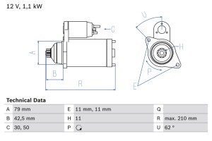 Demaror BOSCH 12V 1,1kW reconditionat AUDI A3 Q3 TT SEAT ALHAMBRA ALTEA XL LEON SKODA KODIAQ OCTAVIA II III 210mm 79mm 11 dinti 2 gauri