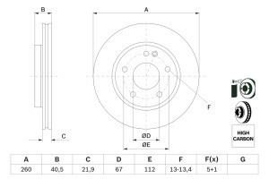Disc frana BOSCH Fata Dreapta/Stanga MERCEDES A (W168) 1.4-1.9 07.97-08.04 Diametru exterior 259.9 mm Inaltime 40.7 mm Grosime 22.0 mm