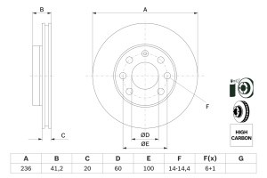 Disc frana BOSCH Fata Dreapta/Stanga 236.0 mm, 41.2 mm, 20.0 mm, 6 gauri, compatibil CHEVROLET AVEO, KALOS, CORSA, SPARK, DAEWOO