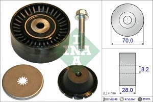 Rola ghidare/conducere curea transmisie INA pentru CHRYSLER SEBRING, DODGE AVENGER, CALIBER, JOURNEY, JEEP COMPASS, PATRIOT, MITSUBISHI GRANDIS, LANCER VIII, OUTLANDER II 2.0D 09.05, diametru 70.0 mm, latime 28.0 mm