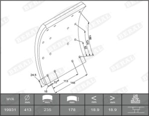 Set garnituri frictiune frana tambur BERAL 413x178 mm 19 mm 259 mm 235 mm 64 nituri 6.65x18 mm 187 mm raza 178 mm latime 413 mm diametru tambur
