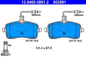 Set placute frana fata ATE cu suruburi de ghidare etrier PEUGEOT 407 1.6D-2.0D 03.04-02.11 67.5mm x 131.4mm x 19.6mm