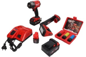 Set scule electrice MILWAUKEE 2 piese, 8 buc, pe baterii, cheie impact aer, lampa atelier, baterii 3 buc, incarcator inclus, 12V/18V, Li-Ion